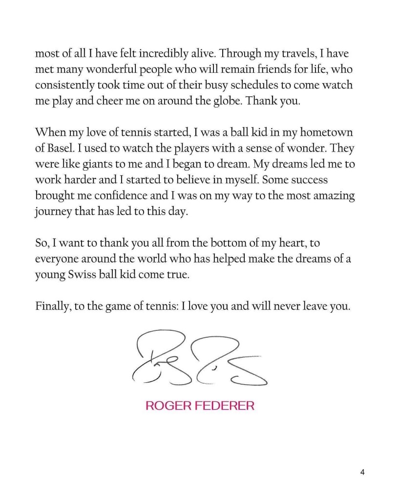 «Quiero dar las gracias a mis rivales en la pista. He sido muy afortunado de jugar muchos partidos épicos que nunca voy a olvidar. Peleamos de forma justa, con pasión e intensidad. Siempre di mi máximo para respetar la historia de este deporte. Me siento extremadamente agradecido. Nos empujamos los unos a los otros y juntos llevamos el tenis a nuevos niveles».