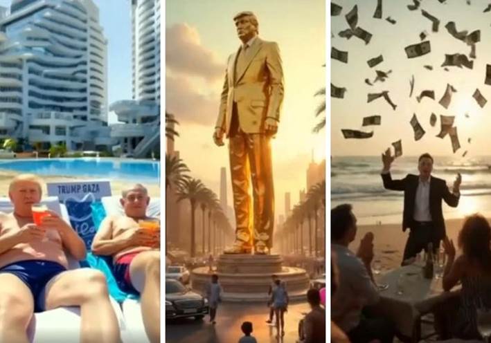 - Su perspectiva sobre cómo resolver conflictos armados es descabellado y cruel. Sobre Gaza ha propuesto para “solucionar” el conflicto, que tuvo como resultado aproximadamente 50,000 muertos y más de 100,000 heridos palestino (un 30% de ellos niños y niñas) que la franja, como zona costera, se convierta en un lujoso resort de vacaciones donde se construyan hoteles y lugares de diversión. Para ello mandó hacer un video en inteligencia artificial (IA) donde se le ve veraneando y tomando tragos con Netanyahu, con una estatua dorada de él y Elon Musk tirando dinero. ¿Y la población gazatí? Según Trump, debería irse a vivir a otros países, así de sencillo.
