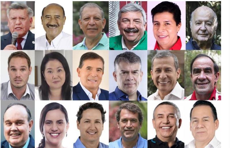 Son 16 hombres y 2 mujeres quienes candidatean a la presidencia de la república del Perú en el proceso electoral del 2021. A pocos días de las elecciones (11 de abril) reina un panorama de muchísima incertidumbre en la cual cualquiera, de un grupo de al menos 5 candidatos, podría ser el siguiente Presidente o Presidenta del Perú por los siguientes 5 años